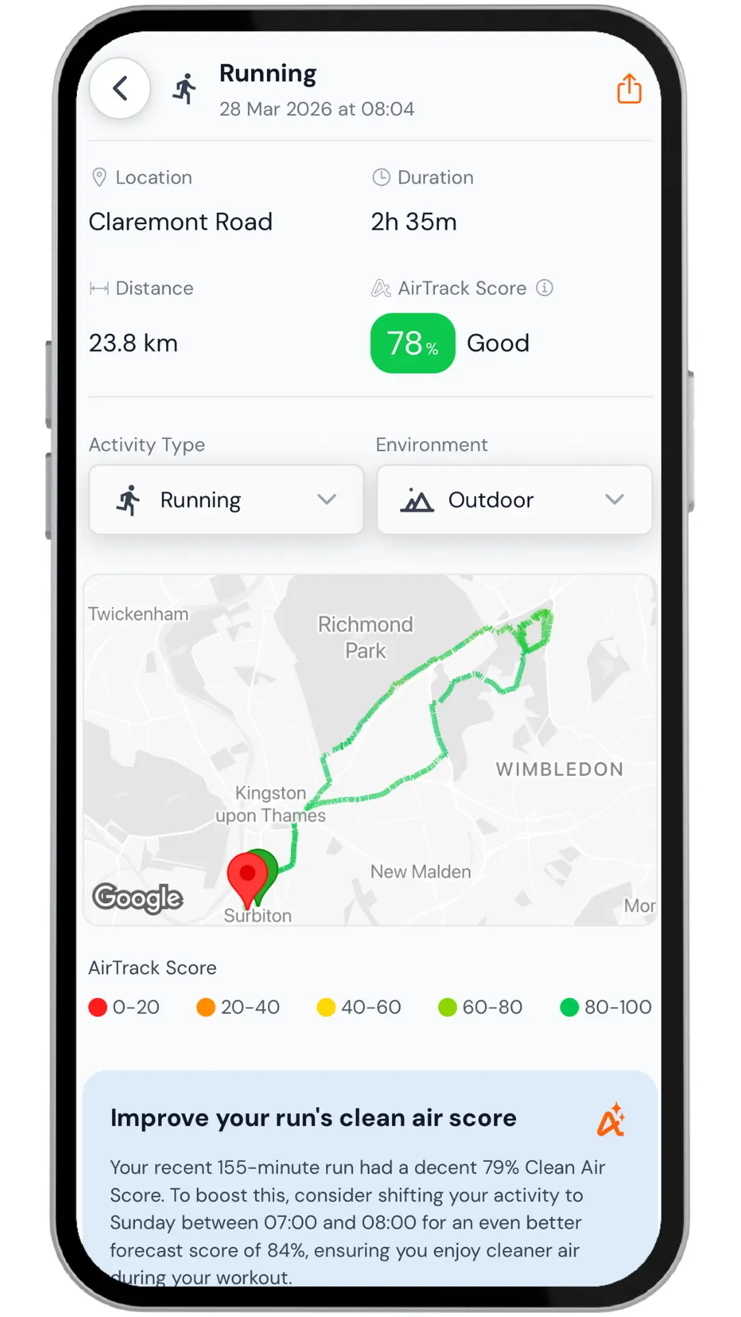 Research shows that air pollution can reduce athletic performance. AirTrack helps you identify cleaner routes and optimise workout times to improve your performance. Check our Articles and Knowledge page for the latest scientific research.