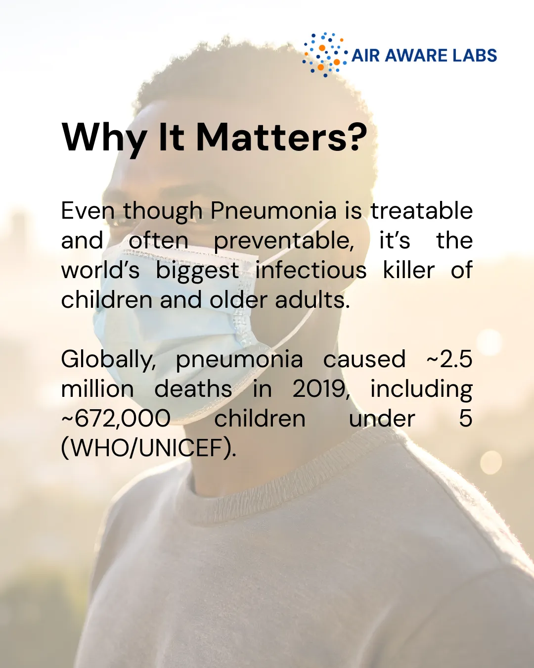 1 in 5 pneumonia deaths among children under five are linked to air pollution. Pneumonia is one of the world’s most preventable respiratory illnesses, yet it still claims over 740,000 young lives every year (WHO, 2022).